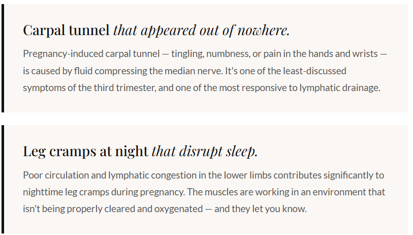 Prenatal lymphatic drainage is a manual therapy technique that uses extremely gentle, rhythmic pressure to activate the lymphatic vessels and guide excess fluid toward elimination. It's not deep tissue massage. There's no pressure on the abdomen. Every movement is deliberate, safe, and adapted specifically to the stage of pregnancy.